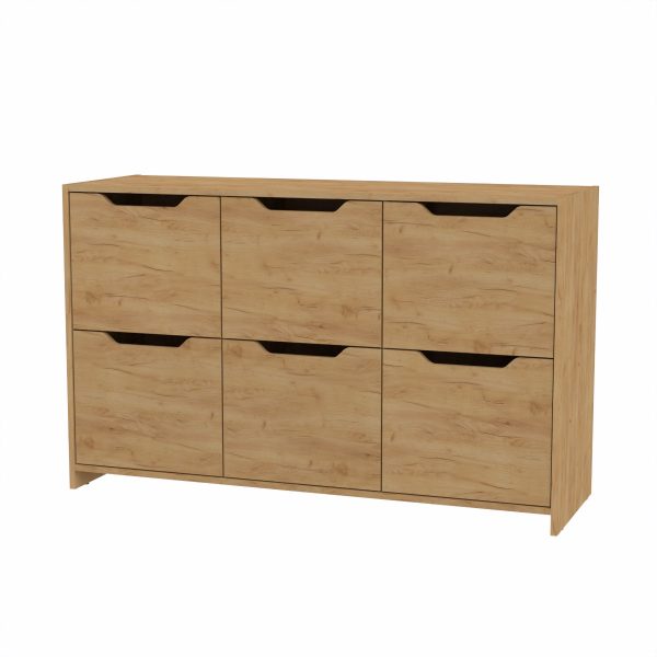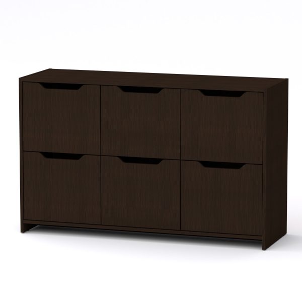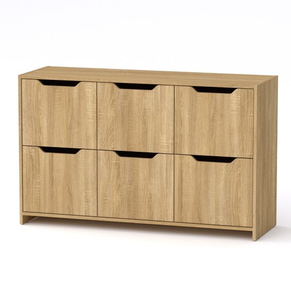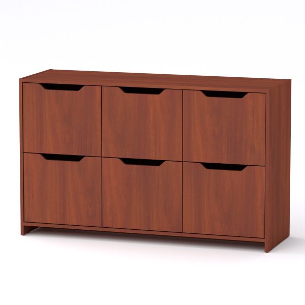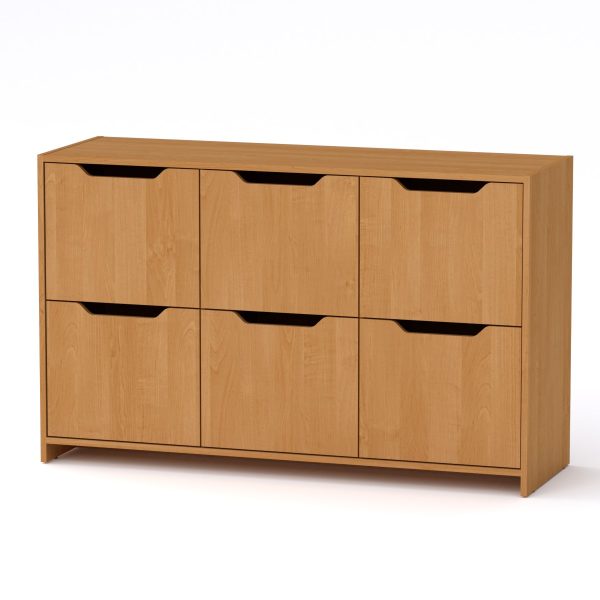 Комод 6Д від фабрики «Компаніт» — це велика шафа-комод з 6 дверима, призначена для зберігання одягу та інших речей, виготовлена з ламінованого ДСП. Габаритні розміри комода становлять 1300 мм (ширина) x 800 мм (висота) x 420 мм (глибина).