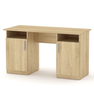 Письмовий стіл «Декан» від фабрики «Компаніт» — це бюджетна модель, виготовлена з ламінованої ДСП товщиною 16 мм, з крайкою з ПВХ (0,5 мм). Він має простору стільницю, тумбу з трьома висувними ящиками та відкритою нішею для зберігання речей. Габарити столу стандартні: ширина — 1100 мм, висота — 736 мм, глибина — 600 мм.