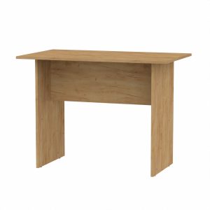 Письмовий стіл «Декан» від фабрики «Компаніт» — це бюджетна модель, виготовлена з ламінованої ДСП товщиною 16 мм, з крайкою з ПВХ (0,5 мм). Він має простору стільницю, тумбу з трьома висувними ящиками та відкритою нішею для зберігання речей. Габарити столу стандартні: ширина — 1100 мм, висота — 736 мм, глибина — 600 мм.