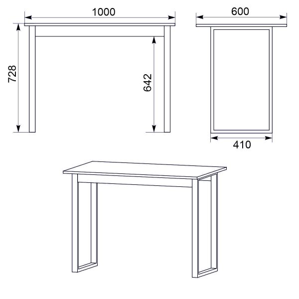 Письмовий стіл “Лофт-1” від виробника “Компаніт” – це сучасні меблі для дому чи офісу, що виготовлені з ламінованого ДСП (товщиною 16 мм) та мають металеві ніжки. Його габарити складають 1000 мм (довжина) х 600 мм (ширина) х 728 мм (висота). Стіл поставляється в розібраному вигляді з комплектом фурнітури для самостійного складання.