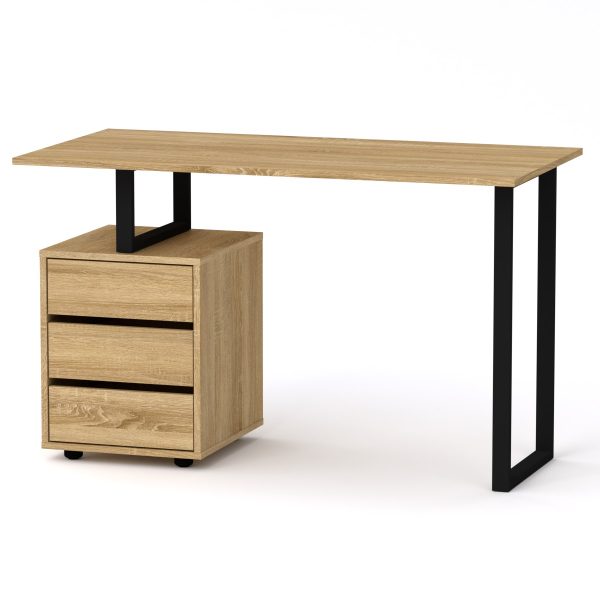 Стіл письмовий “Лофт-2” від виробника “Компаніт” — це прямий комп’ютерний стіл з металевими ніжками, виготовлений з ЛДСП товщиною 16 мм. Він має прямокутну стільницю розмірами 1200×600 мм і висотою 728 мм. Тумба столу оснащена трьома висувними ящиками на роликових напрямних.